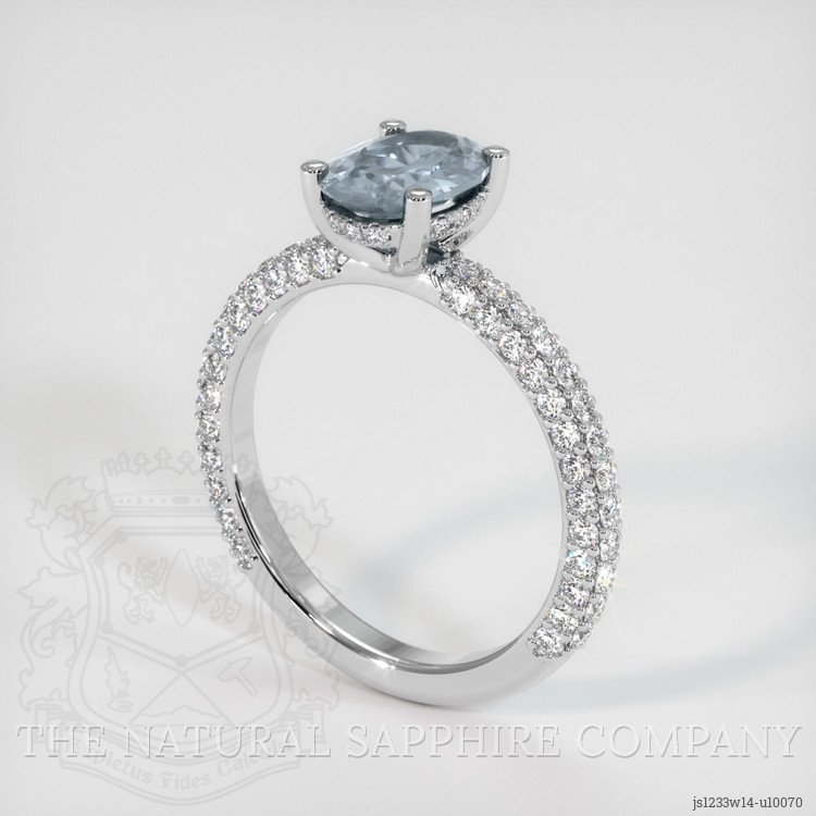 The ring features a beautiful, transparent 1.52 carat oval shape bluish gray sapphire with the dimensions of 8.66 x 6.45 x 3.32 mm and a mixed brilliant cut. It has a clarity grade of very slightly included (evaluated at eye level), medium light color saturation, and an excellent polish. The origin of this sapphire is Montana.