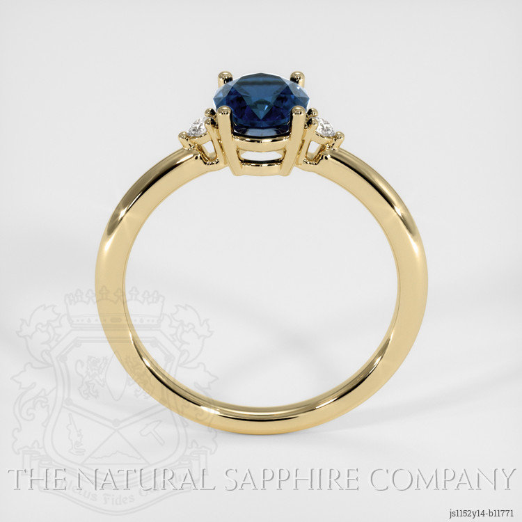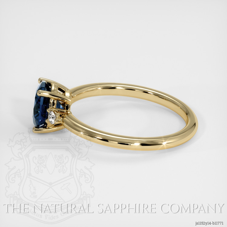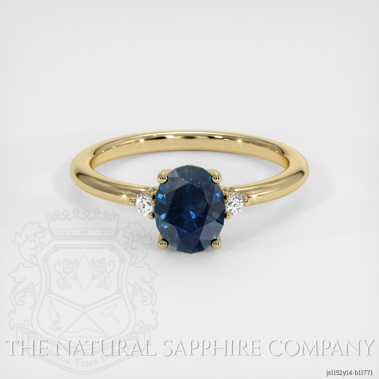 The ring features a beautiful, transparent 1.72 carat oval shape greenish blue sapphire with the dimensions of 7.89 x 6.36 x 4.61 mm and a fancy brilliant cut. It has a clarity grade of very slightly included (evaluated at eye level), intense color saturation, and an excellent polish. The origin of this sapphire is Montana.
