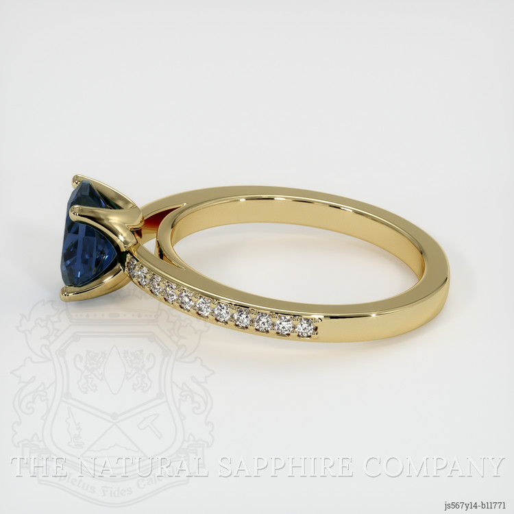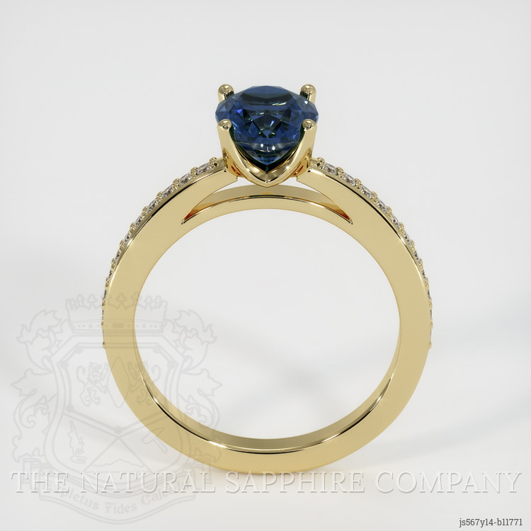 The ring features a beautiful, transparent 1.72 carat oval shape greenish blue sapphire with the dimensions of 7.89 x 6.36 x 4.61 mm and a fancy brilliant cut. It has a clarity grade of very slightly included (evaluated at eye level), intense color saturation, and an excellent polish. The origin of this sapphire is Montana.