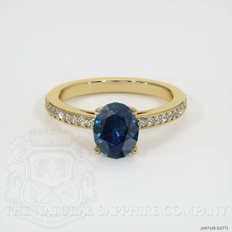 The ring features a beautiful, transparent 1.72 carat oval shape greenish blue sapphire with the dimensions of 7.89 x 6.36 x 4.61 mm and a fancy brilliant cut. It has a clarity grade of very slightly included (evaluated at eye level), intense color saturation, and an excellent polish. The origin of this sapphire is Montana.