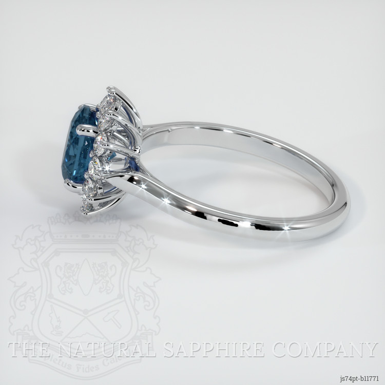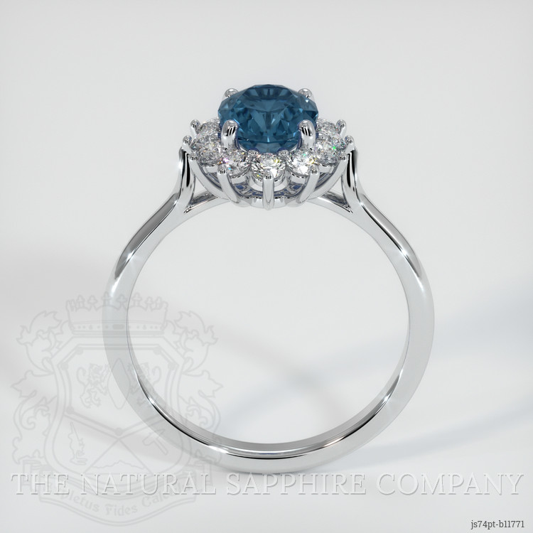 The ring features a beautiful, transparent 1.72 carat oval shape greenish blue sapphire with the dimensions of 7.89 x 6.36 x 4.61 mm and a fancy brilliant cut. It has a clarity grade of very slightly included (evaluated at eye level), intense color saturation, and an excellent polish. The origin of this sapphire is Montana.
