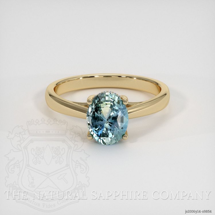 The ring features a beautiful, transparent 1.99 carat oval shape greenish blue sapphire with the dimensions of 8.36 x 6.56 x 4.63 mm and a mixed brilliant cut. It has a clarity grade of very slightly included, evaluated at eye level, medium light color saturation, and an excellent polish. The origin of this sapphire is Ceylon, Sri Lanka. The ring's setting significantly enhances the gemstone's color and clarity. The thoughtful design and craftsmanship ensure that light enters the sapphire at optimal angles, highlighting the gemstone's natural brilliance and saturation. The mixed brilliant cut further amplifies the depth of color and luminosity, making the greenish blue hues appear even more vibrant and mesmerizing. The setting's gold prongs are meticulously crafted to hold the sapphire securely without obstructing the light, allowing an unobstructed view of the gemstone from various angles.