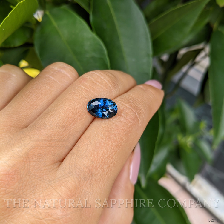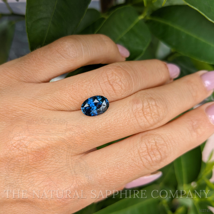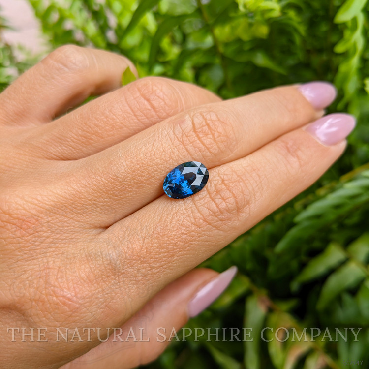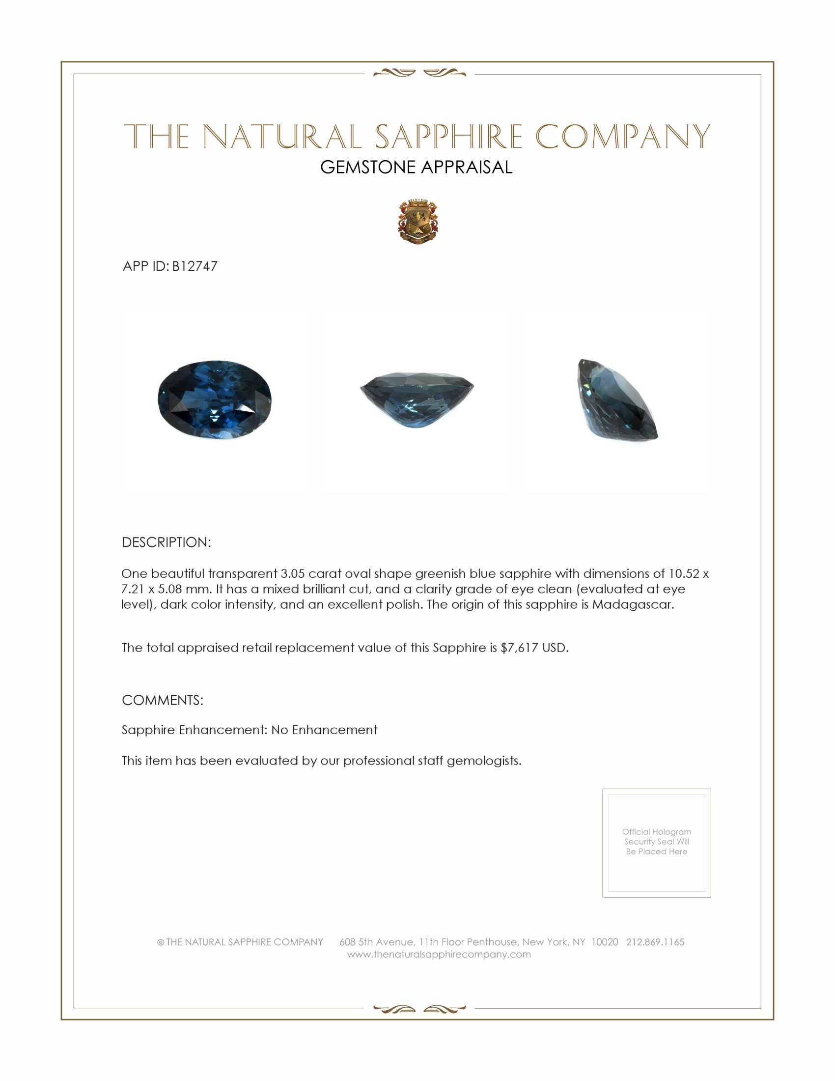 The men's ring features a beautiful, transparent 3.05 carat oval shape greenish blue sapphire with the dimensions of 10.52 x 7.21 x 5.08 mm and a mixed brilliant cut. It has a clarity grade of eye clean (evaluated at eye level), vivid color saturation, and an excellent polish. The origin of this sapphire is Madagascar.