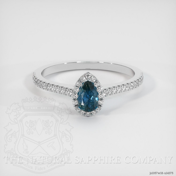 The ring features a beautiful, transparent 0.55 carat pear shape greenish blue sapphire with the dimensions of 6.70 x 4.21 x 2.73 mm and a mixed brilliant cut. It has a clarity grade of very slightly included (evaluated at eye level), intense color saturation, and an excellent polish. The origin of this sapphire is Montana.