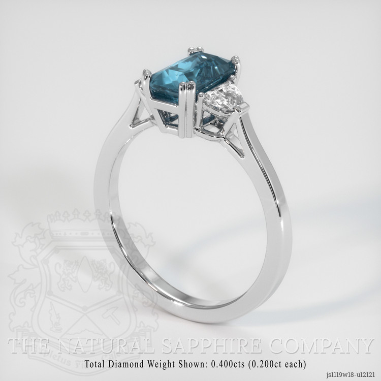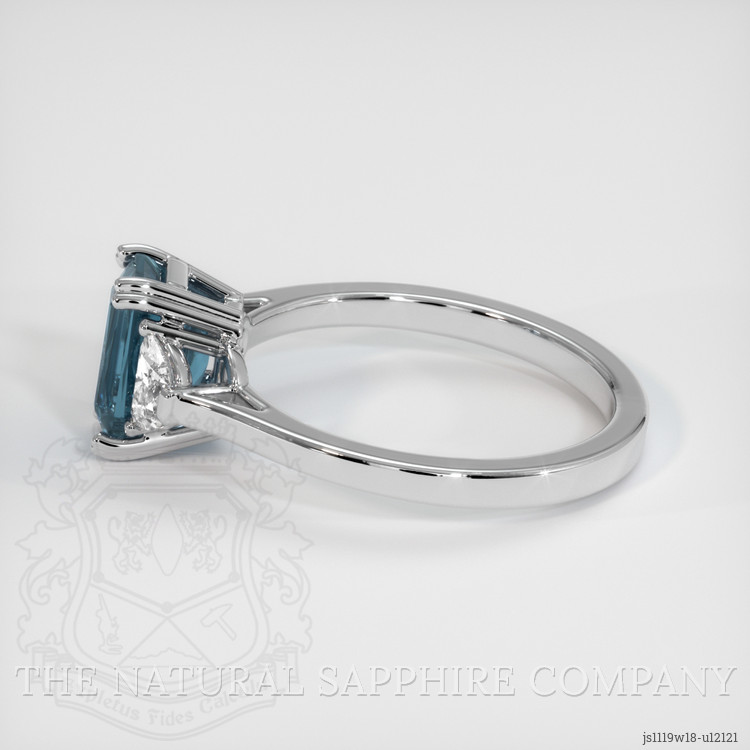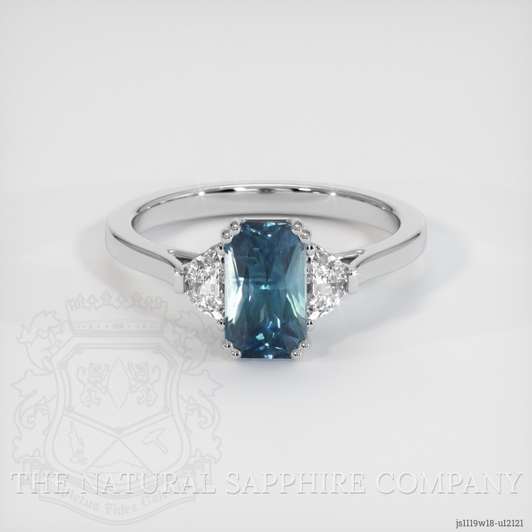 The ring features a beautiful, transparent 2.01 carat radiant shape greenish blue sapphire with the dimensions of 8.47 x 5.09 x 4.81 mm and a radiant cut. It has a clarity grade of slightly included (evaluated at eye level), intense color saturation, and an excellent polish. The origin of this sapphire is Montana.
