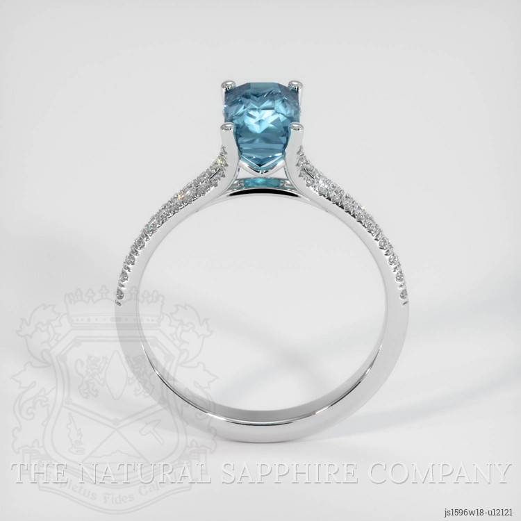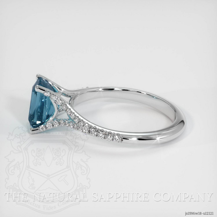The ring features a beautiful, transparent 2.01 carat radiant shape greenish blue sapphire with the dimensions of 8.47 x 5.09 x 4.81 mm and a radiant cut. It has a clarity grade of slightly included (evaluated at eye level), intense color saturation, and an excellent polish. The origin of this sapphire is Montana.
