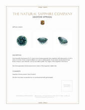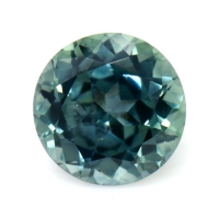 The ring features a beautiful, transparent 0.57 carat round shape greenish blue sapphire with the dimensions of 4.90 x 4.84 x 3.15 mm and a mixed brilliant cut. It has a clarity grade of eye clean (evaluated at eye level), intense color saturation, and an excellent polish. The origin of this sapphire is Montana.