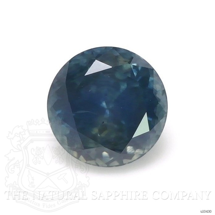The ring features a beautiful, transparent 0.58 carat round shape greenish blue sapphire with the dimensions of 4.79 x 4.76 x 3.40 mm and a mixed brilliant cut. It has a clarity grade of very slightly included (evaluated at eye level), intense color saturation, and an excellent polish. The origin of this sapphire is Montana.