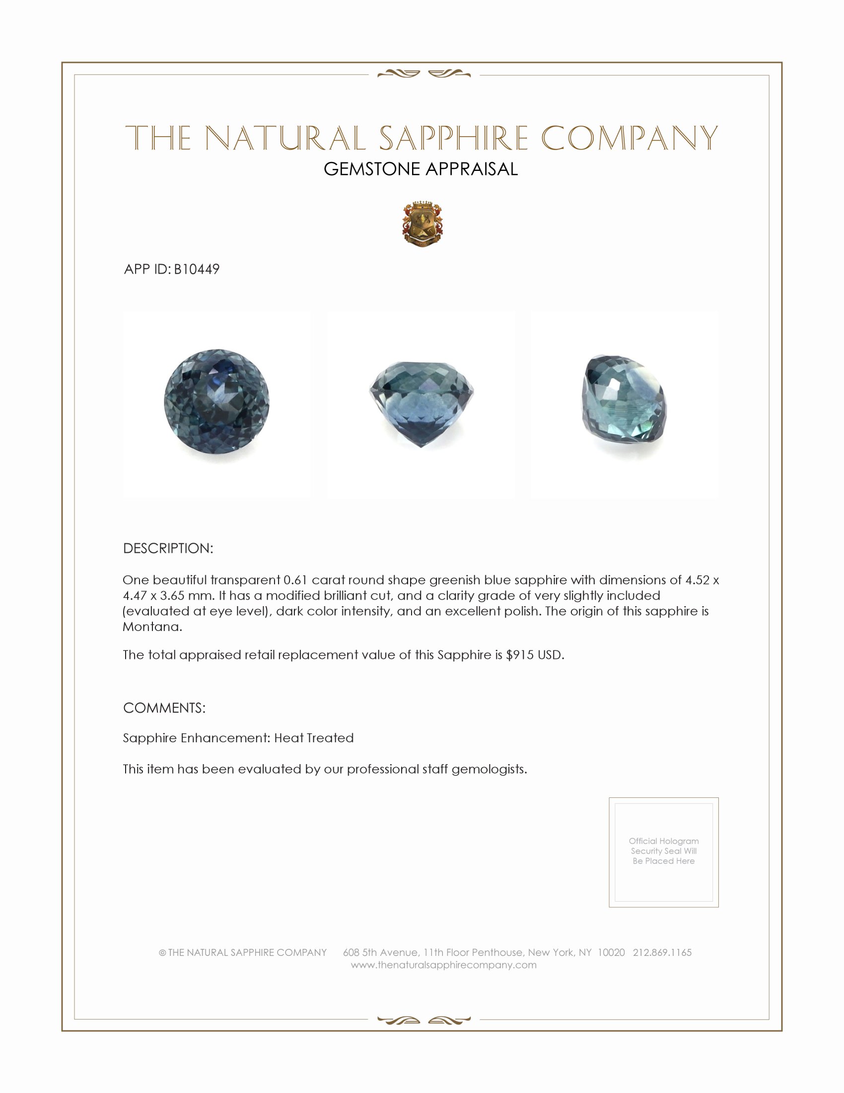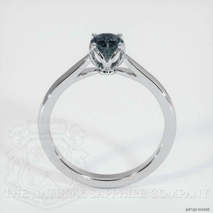 The ring features a beautiful, transparent 0.61 carat round shape greenish blue sapphire with the dimensions of 4.52 x 4.47 x 3.65 mm and a modified brilliant cut. It has a clarity grade of very slightly included (evaluated at eye level), dark color saturation, and an excellent polish. The origin of this sapphire is Montana.