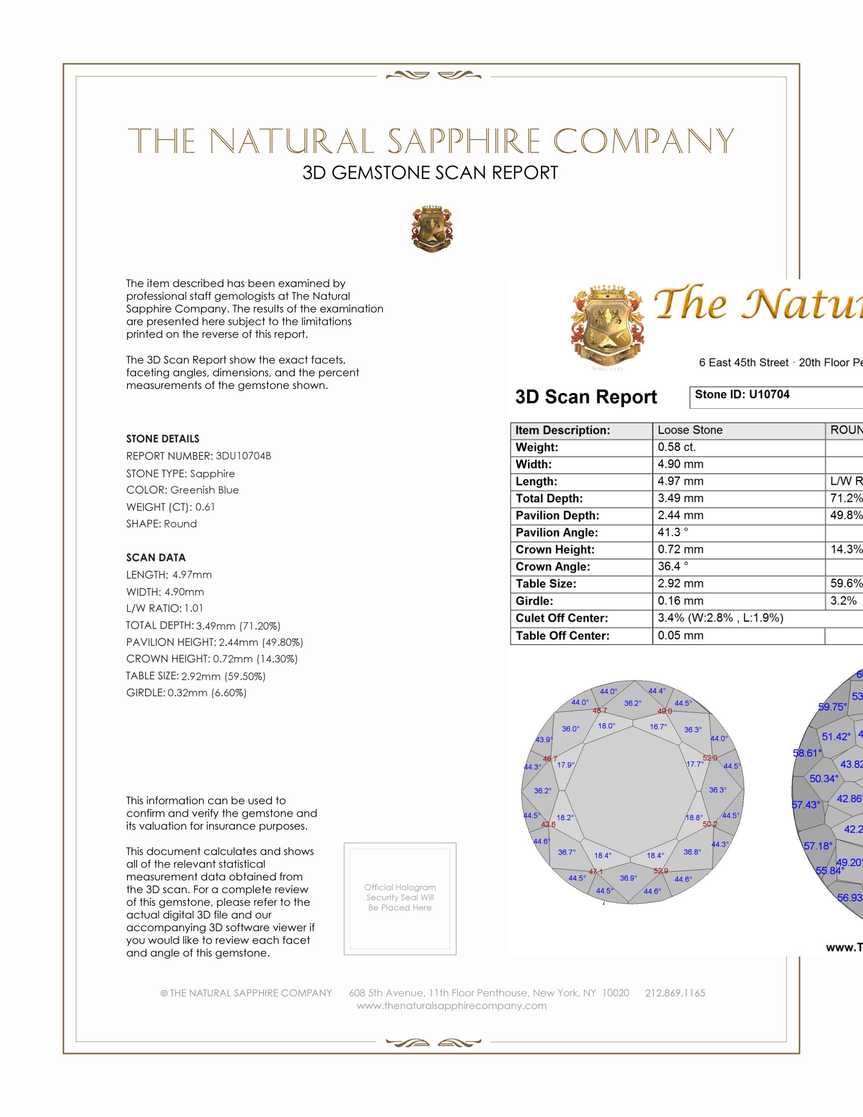 The ring features a beautiful, transparent 0.61 carat round shape greenish blue sapphire with the dimensions of 4.97 x 4.90 x 3.49 mm and a mixed brilliant cut. It has a clarity grade of eye clean (evaluated at eye level), intense color saturation, and an excellent polish. The origin of this sapphire is Montana.