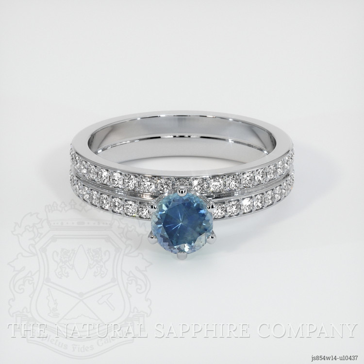The ring features a beautiful, transparent 0.90 carat round shape greenish blue sapphire with the dimensions of 5.65 x 5.58 x 4.06 mm and a mixed brilliant cut. It has a clarity grade of very slightly included (evaluated at eye level), intense color saturation, and an excellent polish. The origin of this sapphire is Montana.