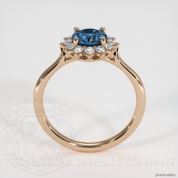 The band and setting are rendered entirely in 18 carat rose gold, selected for its warm tonality that complements the greenish blue hue of the sapphire and the high color grade of the diamonds. The shank tapers gently toward the head, offering visual balance and a secure hand fit without adding visual weight, while the prong geometry is executed to optimize durability and stone visibility. The design reflects The Natural Sapphire Company emphasis on responsible sourcing, gemological documentation, and precise finishing, with each facet and setting detail aligned to enhance optical performance rather than to distract. Practical considerations include a robust prong count, a modest crown height for everyday wear, and materials chosen for long term stability. Care recommendations are straightforward, involving routine gentle cleaning with warm water and mild detergent, periodic professional inspection of prongs and settings, and avoidance of harsh chemicals. Overall the piece presents a considered union of natural gem quality and disciplined design, appropriate for both daily wear and considered occasions.