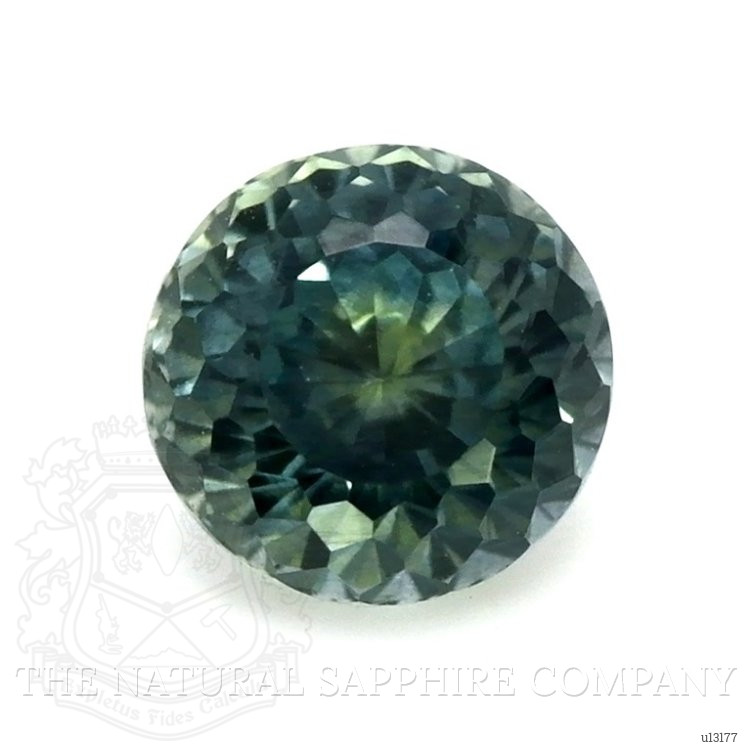 The ring features a beautiful, transparent 1.09 carat round shape greenish blue sapphire with the dimensions of 5.51 x 5.40 x 4.55 mm and a mixed brilliant cut. It has a clarity grade of eye clean (evaluated at eye level), intense color saturation, and an excellent polish. The origin of this sapphire is Montana.