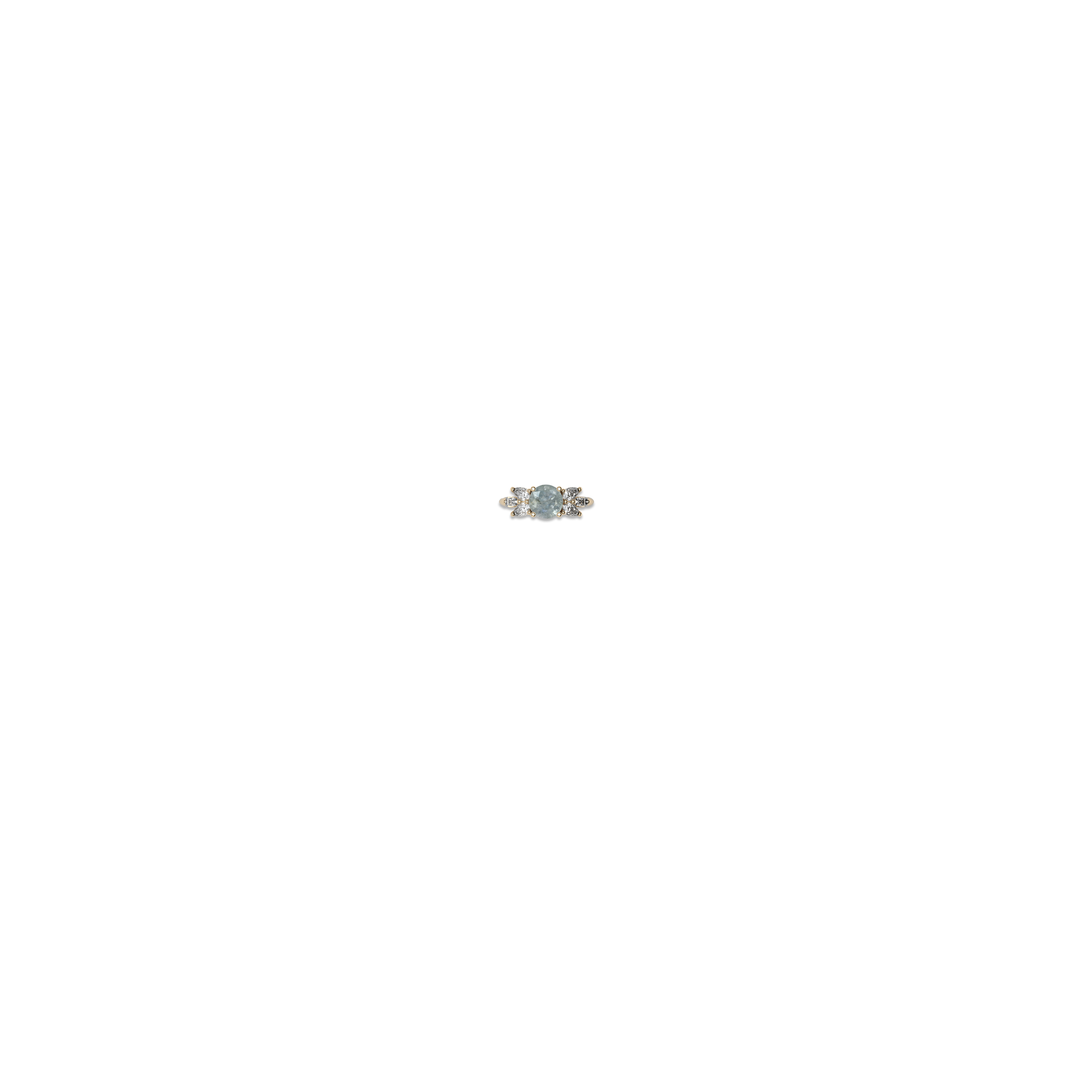The ring features a beautiful, transparent 1.15 carat round shape greenish blue sapphire with the dimensions of 6.34 x 6.26 x 4.18 mm and a mixed brilliant cut. It has a clarity grade of slightly included (evaluated at eye level), medium light color saturation, and an excellent polish. The origin of this sapphire is Montana.