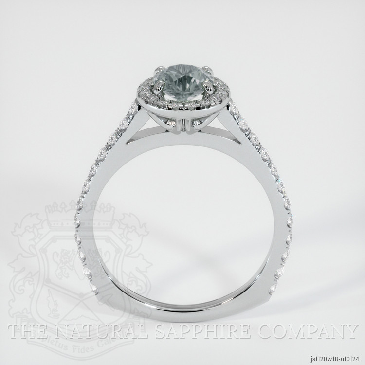 The ring features a beautiful, transparent 1.15 carat round shape greenish blue sapphire with the dimensions of 6.34 x 6.26 x 4.18 mm and a mixed brilliant cut. It has a clarity grade of slightly included (evaluated at eye level), medium light color saturation, and an excellent polish. The origin of this sapphire is Montana.