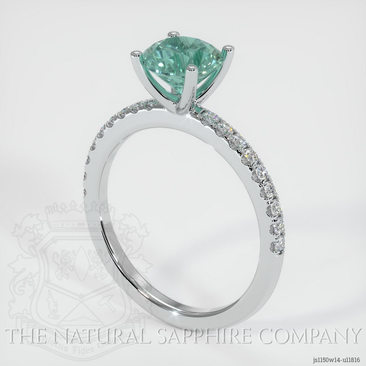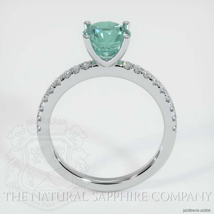The ring features a beautiful, transparent 1.19 carat round shape greenish blue sapphire with the dimensions of 6.33 x 6.27 x 4.18 mm and a brilliant cut. It has a clarity grade of very slightly included (evaluated at eye level), medium intense color saturation, and an excellent polish. The origin of this sapphire is Montana.
