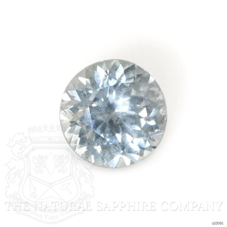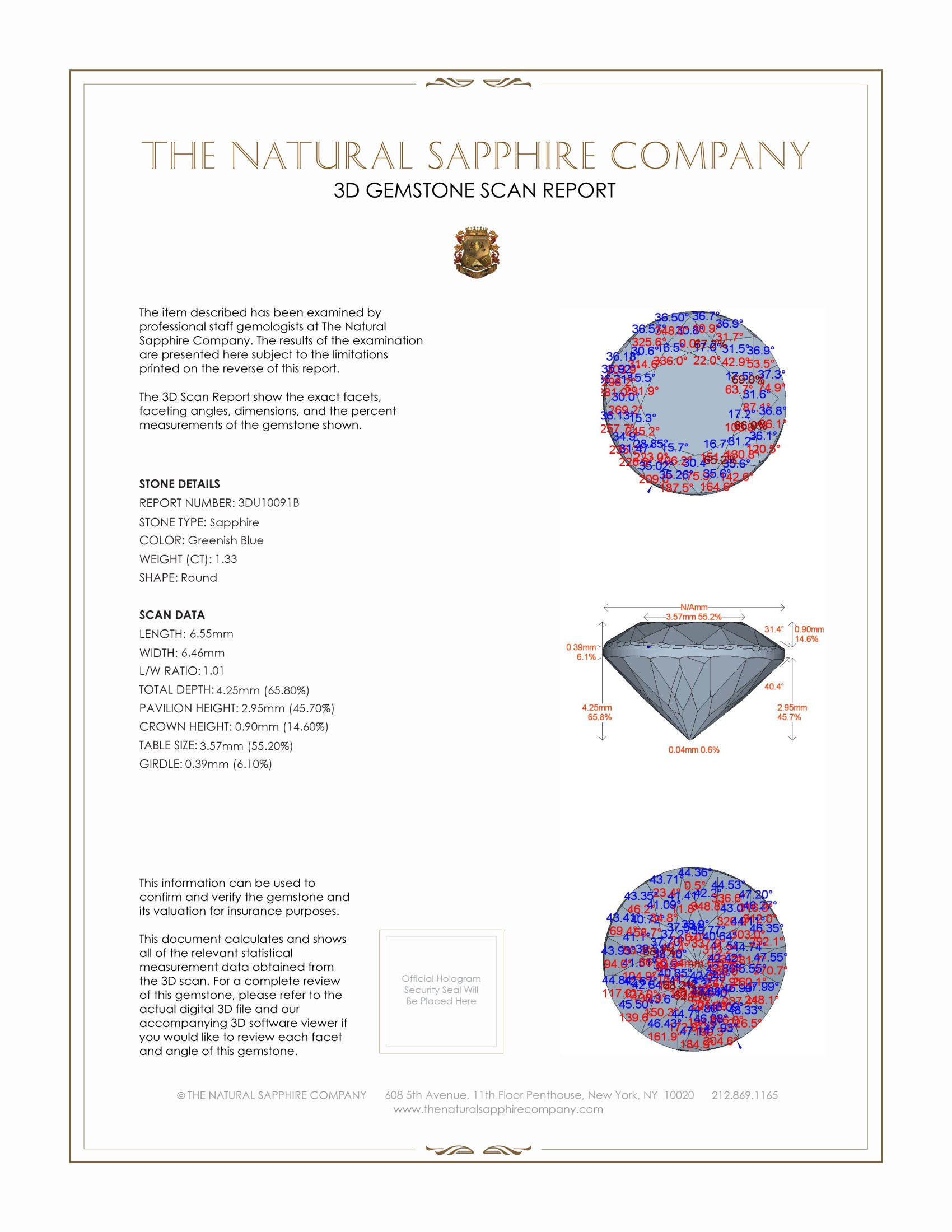 The ring features a beautiful, transparent 1.33 carat round shape greenish blue sapphire with the dimensions of 6.55 x 6.46 x 4.25 mm and a mixed brilliant cut. It has a clarity grade of very slightly included (evaluated at eye level), medium intense color saturation, and an excellent polish. The origin of this sapphire is Ceylon (Sri Lanka).