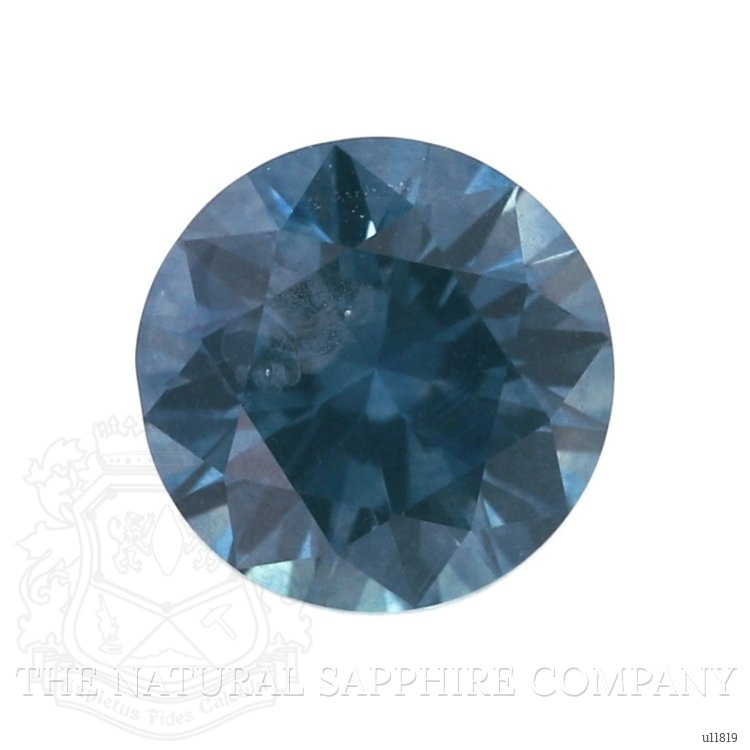 The ring features a beautiful, transparent 1.44 carat round shape greenish blue sapphire with the dimensions of 6.79 x 6.72 x 4.46 mm and a brilliant cut. It has a clarity grade of very slightly included (evaluated at eye level), vivid color saturation, and an excellent polish. The origin of this sapphire is Montana.