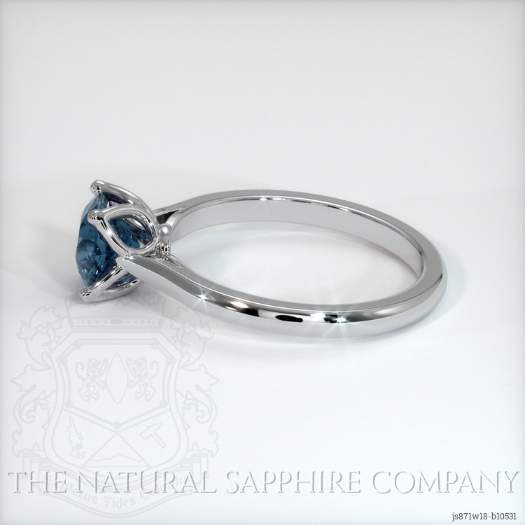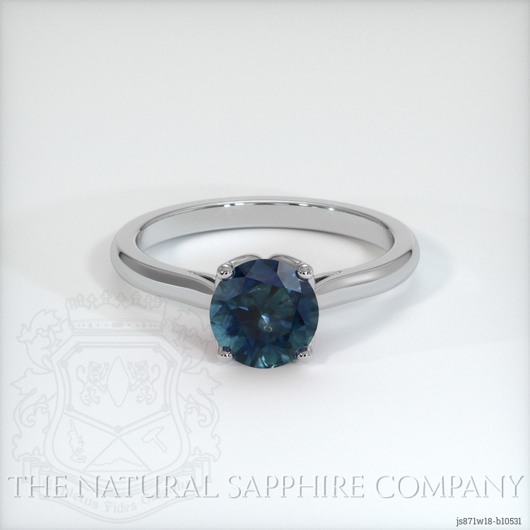 The ring features a beautiful, transparent 1.56 carat round shape greenish blue sapphire with the dimensions of 6.98 x 6.90 x 4.55 mm and a brilliant cut. It has a clarity grade of slightly included (evaluated at eye level), dark color saturation, and an excellent polish. The origin of this sapphire is Montana.