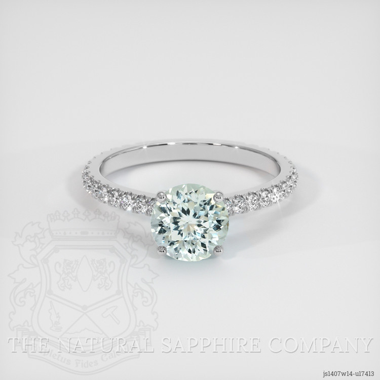 The ring features a beautiful, transparent 1.92 carat round shape greenish blue sapphire with the dimensions of 7.44 x 7.34 x 5.01 mm and a mixed brilliant cut. It has a clarity grade of very slightly included (evaluated at eye level), very light color saturation, and an excellent polish. The origin of this sapphire is Montana.