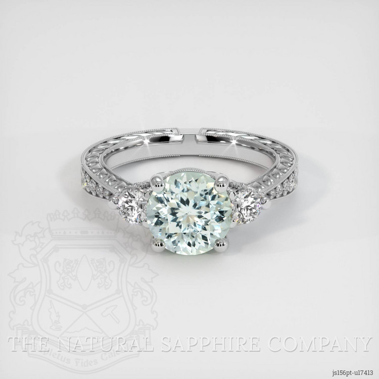 The ring features a beautiful, transparent 1.92 carat round shape greenish blue sapphire with the dimensions of 7.44 x 7.34 x 5.01 mm and a mixed brilliant cut. It has a clarity grade of very slightly included (evaluated at eye level), very light color saturation, and an excellent polish. The origin of this sapphire is Montana.