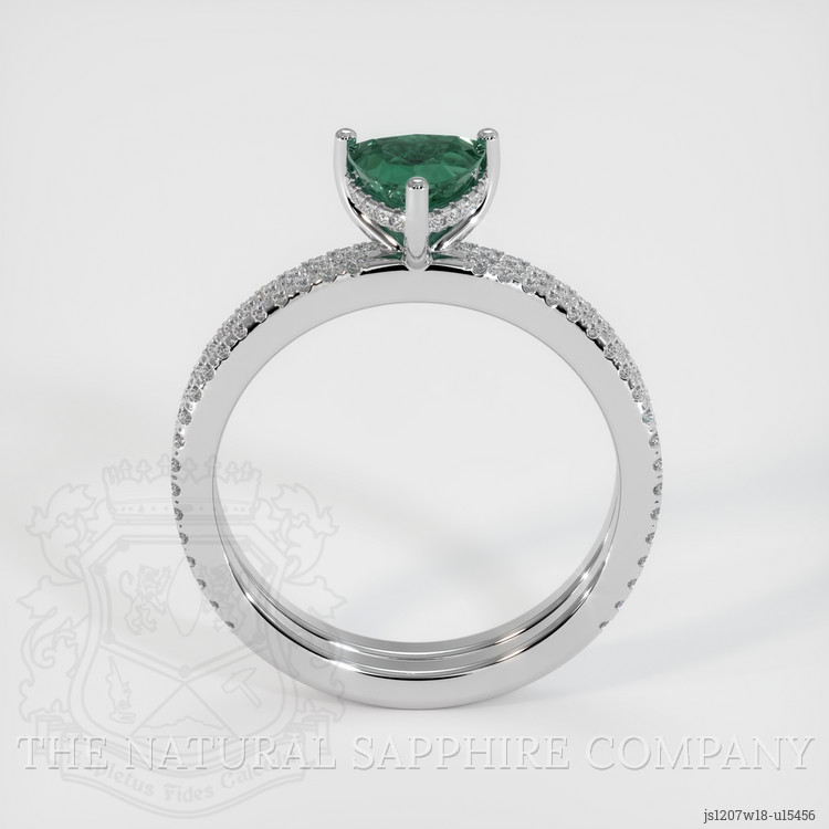The ring features a beautiful, transparent 0.83 carat trillion shape greenish blue sapphire with the dimensions of 5.59 x 5.40 x 3.84 mm and a trillion cut. It has a clarity grade of very slightly included (evaluated at eye level), intense color saturation, and an excellent polish. The origin of this sapphire is Montana.