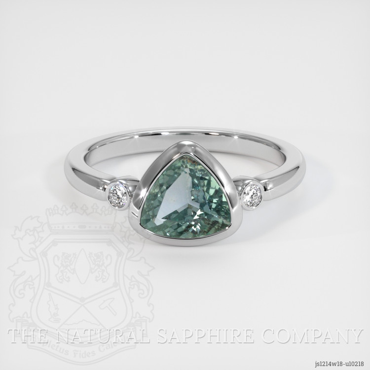 The ring features a beautiful, transparent 1.05 carat trillion shape greenish blue sapphire with the dimensions of 6.69 x 7.03 x 3.10 mm and a mixed brilliant cut. It has a clarity grade of very slightly included (evaluated at eye level), medium intense color saturation, and an excellent polish. The origin of this sapphire is Montana.