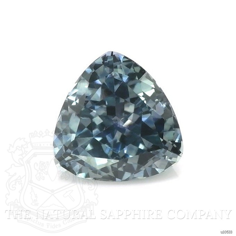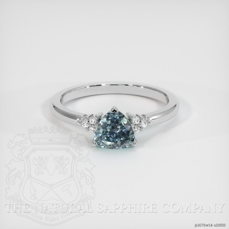 The ring features a beautiful, transparent 1.24 carat trillion shape greenish blue sapphire with the dimensions of 6.48 x 6.57 x 4.14 mm and a trillion cut. It has a clarity grade of very slightly included (evaluated at eye level), vivid color saturation, and an excellent polish. The origin of this sapphire is Montana.