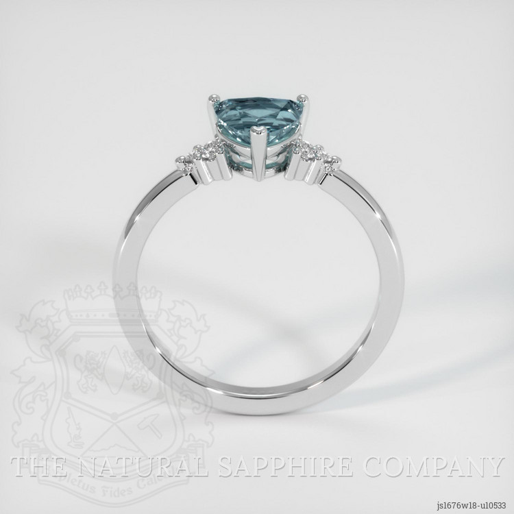 The ring features a beautiful, transparent 1.24 carat trillion shape greenish blue sapphire with the dimensions of 6.48 x 6.57 x 4.14 mm and a trillion cut. It has a clarity grade of very slightly included (evaluated at eye level), vivid color saturation, and an excellent polish. The origin of this sapphire is Montana.