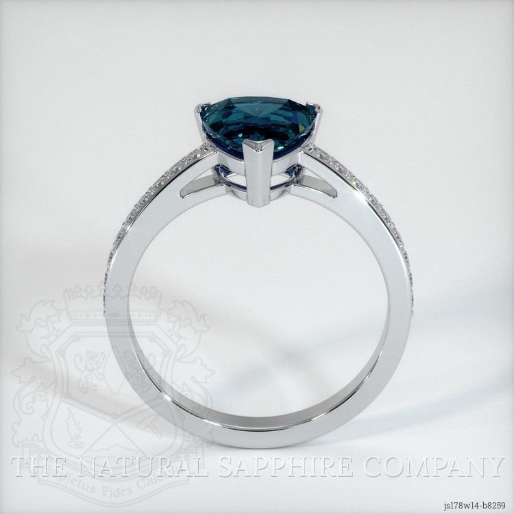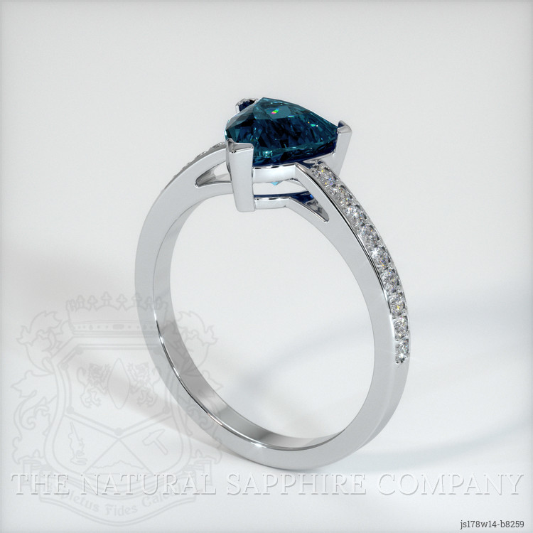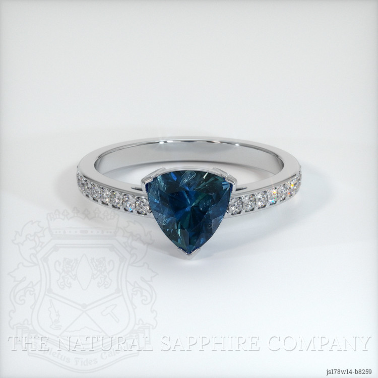 The ring features a beautiful, transparent 1.69 carat trillion shape greenish blue sapphire with the dimensions of 7.02 x 7.14 x 4.95 mm and a trillion cut. It has a clarity grade of very slightly included (evaluated at eye level), vivid color saturation, and an excellent polish. The origin of this sapphire is Montana.