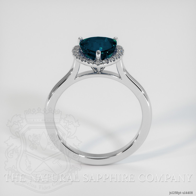 The ring features a beautiful, transparent 2.69 carat trillion shape greenish blue sapphire with the dimensions of 7.97 x 7.54 x 5.88 mm and a trillion cut. It has a clarity grade of eye clean (evaluated at eye level), dark color saturation, and an excellent polish. The origin of this sapphire is Madagascar.