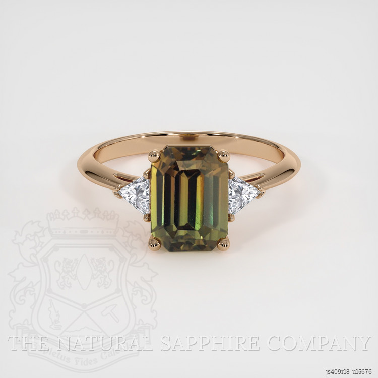 In the gentle embrace of twilight, where dreams whisper, lies a creation from The Natural Sapphire Company that tells a story of elegance and enchantment. This extraordinary ring centers on a transparent emerald-cut greenish brown sapphire, a 3.65 carat wonder. Originating from the lush landscapes of Ceylon, it reflects the secrets of time itself. Its dimensions of 9.23 x 6.86 x 5.36 mm reveal a step cut marvel that dances with every glimmer of light. The sapphire’s clarity, eye clean and polished to perfection, reveals a depth and luster that speaks to endless possibilities.