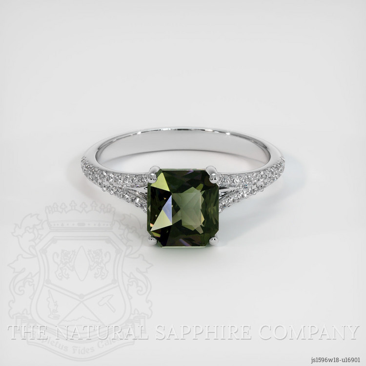The ring features a beautiful, transparent 2.97 carat radiant shape greenish brown sapphire with the dimensions of 8.09 x 7.21 x 5.19 mm and a radiant cut. It has a clarity grade of very slightly included (evaluated at eye level), intense color saturation, and an excellent polish. The origin of this sapphire is Ceylon (Sri Lanka).