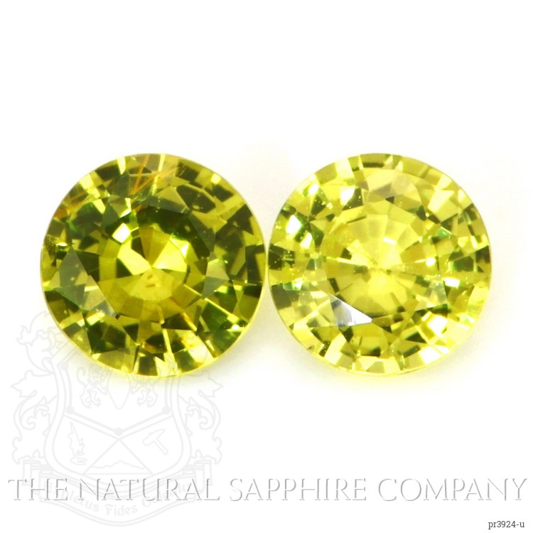 The earrings feature a beautiful, transparent pair of sapphires that are 2.12 total carat weight. They are round shape yellowish green sapphires, with the dimensions of 6.31 x 6.25 x 3.68 mm and are mixed brilliant cut, have a clarity grade of eye clean (evaluated at eye level), intense color saturation, and an excellent polish. The origin of this pair of sapphires is Ceylon (Sri Lanka).