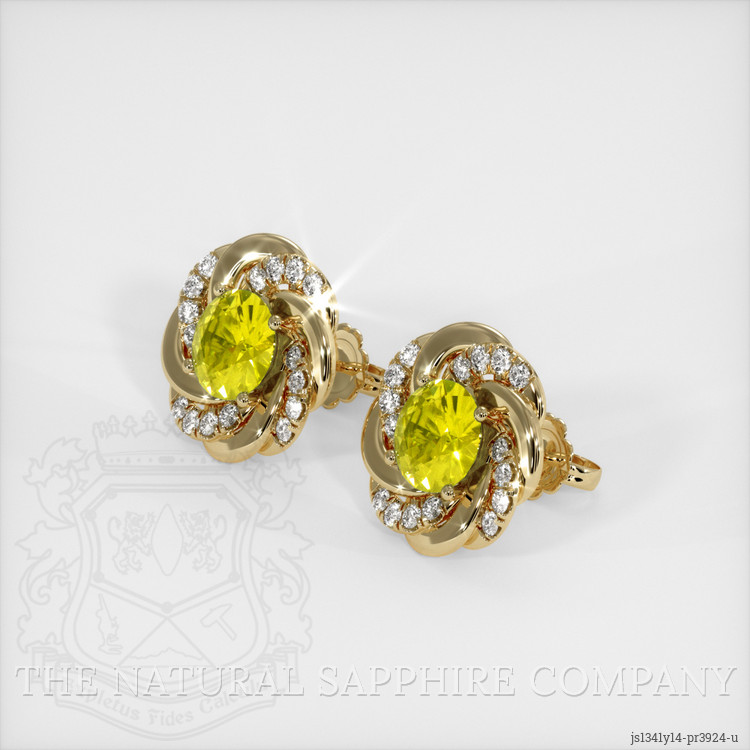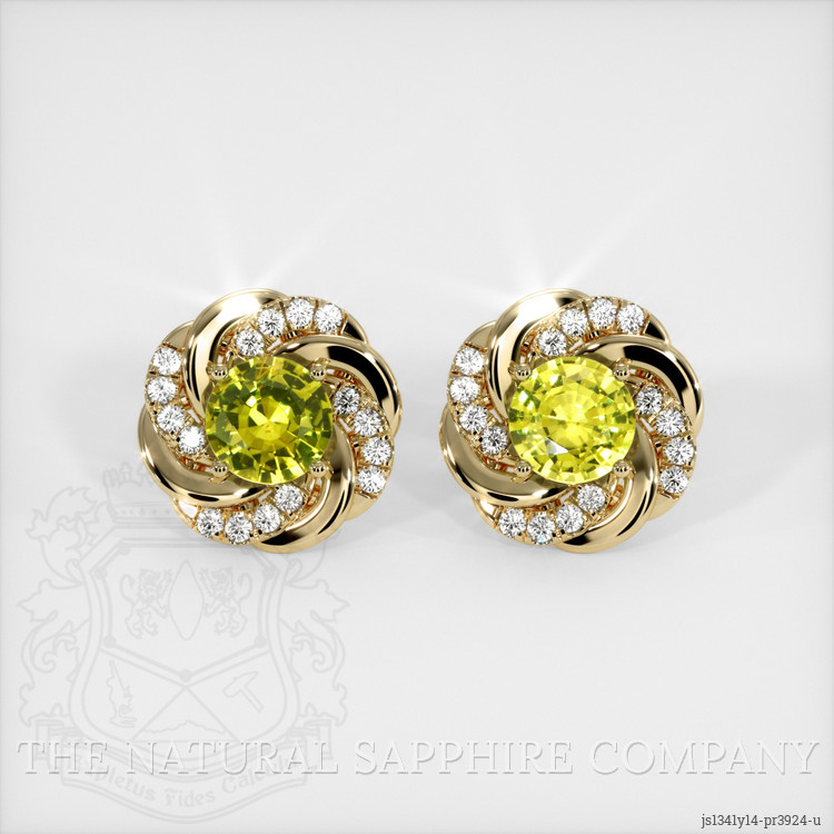 The earrings feature a beautiful, transparent pair of sapphires that are 2.12 total carat weight. They are round shape yellowish green sapphires, with the dimensions of 6.31 x 6.25 x 3.68 mm and are mixed brilliant cut, have a clarity grade of eye clean (evaluated at eye level), intense color saturation, and an excellent polish. The origin of this pair of sapphires is Ceylon (Sri Lanka).