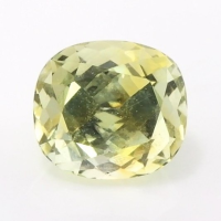 The ring features a beautiful, transparent 1.01 carat cushion shape greenish yellow sapphire with the dimensions of 5.95 x 5.36 x 4.01 mm and a mixed brilliant cut. It has a clarity grade of very slightly included (evaluated at eye level), medium color saturation, and an excellent polish. The origin of this sapphire is Montana.