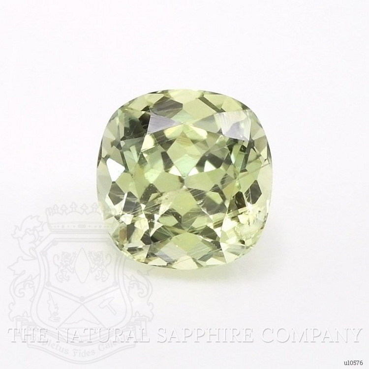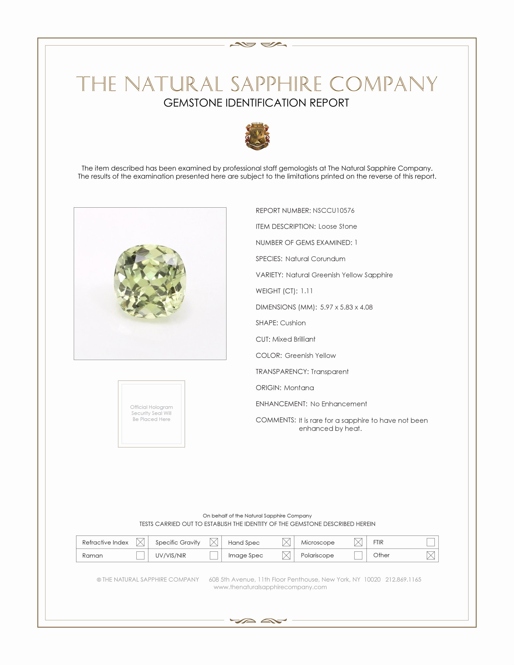 The ring features a beautiful, transparent 1.11 carat cushion shape greenish yellow sapphire with the dimensions of 5.97 x 5.83 x 4.08 mm and a mixed brilliant cut. It has a clarity grade of very slightly included (evaluated at eye level), medium color saturation, and an excellent polish. The origin of this sapphire is Montana.