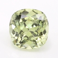 The ring features a beautiful, transparent 1.11 carat cushion shape greenish yellow sapphire with the dimensions of 5.97 x 5.83 x 4.08 mm and a mixed brilliant cut. It has a clarity grade of very slightly included (evaluated at eye level), medium color saturation, and an excellent polish. The origin of this sapphire is Montana.