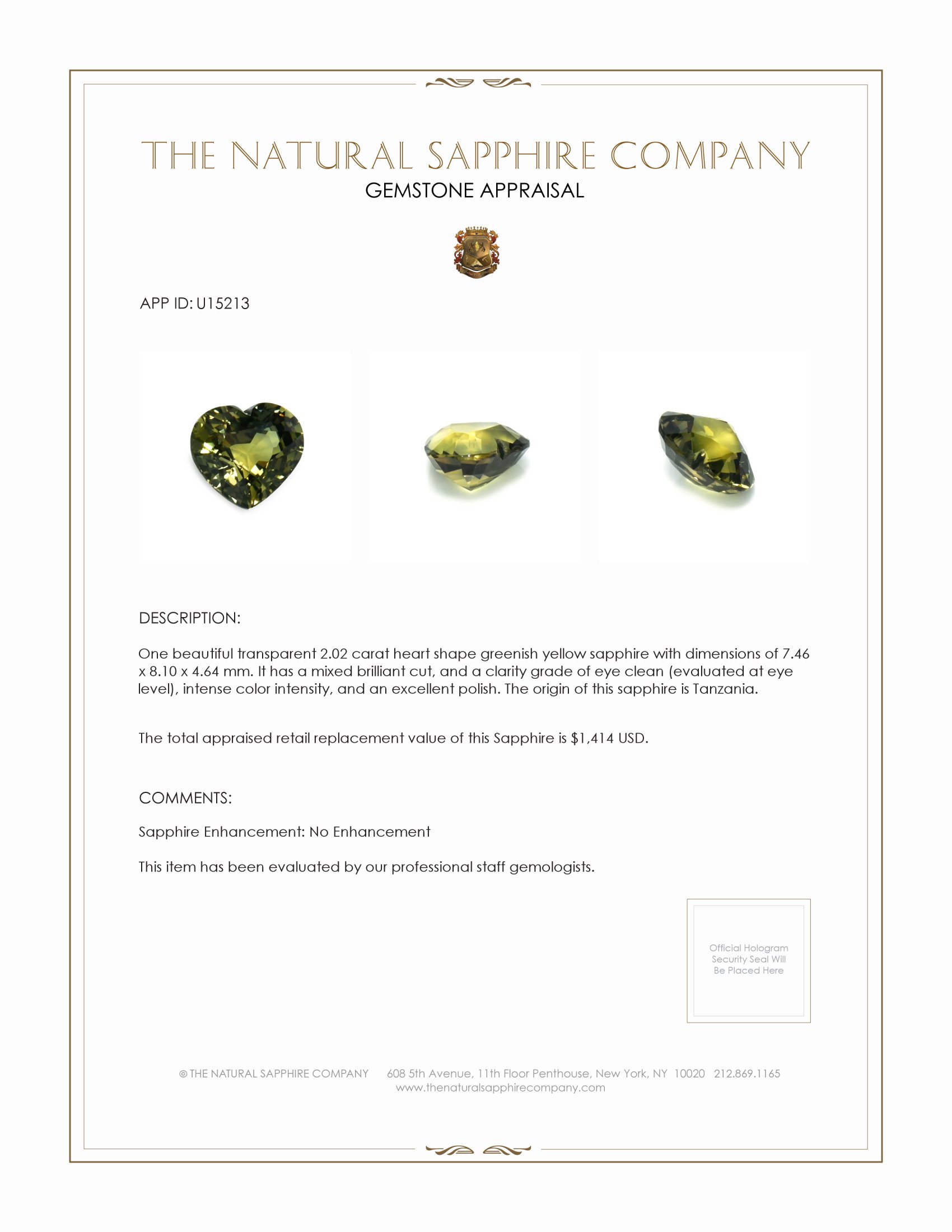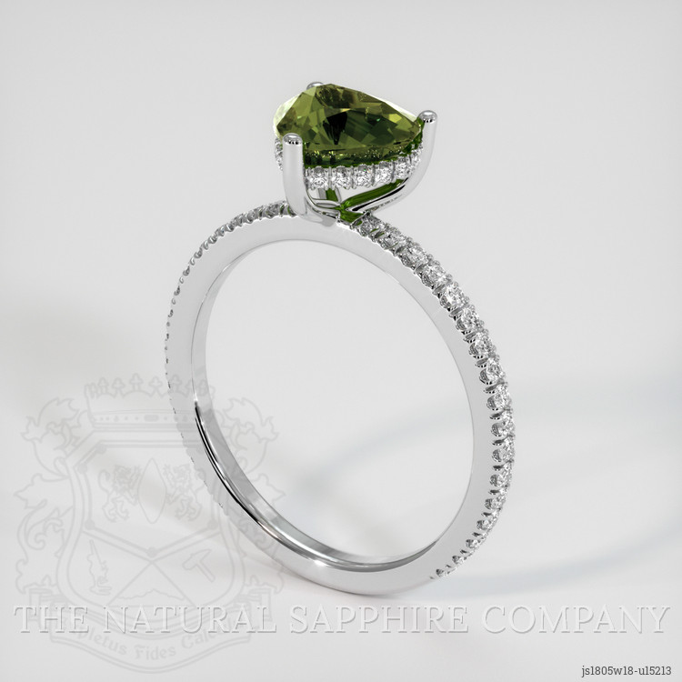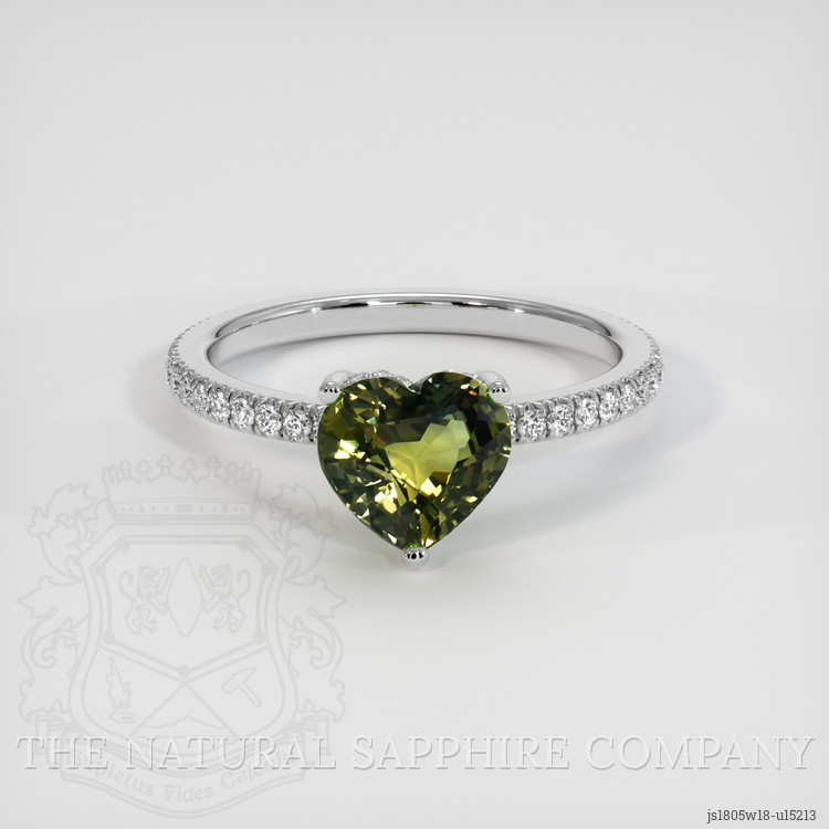 Introducing an exquisite piece from The Natural Sapphire Company, this ring showcases a resplendent 2.02 carat heart-shaped greenish-yellow sapphire. This beautiful gemstone, measuring 7.46 x 8.10 x 4.64 mm, captivates with its natural and unfettered charm. Unlike many gemstones on the market, which often require treatments to amplify their visual appeal, this sapphire shines in its pure form, untarnished by enhancement. With its mixed brilliant cut, the sapphire radiates an unparalleled intensity of color that rivals many other stones. The eye-clean clarity and intense color saturation further exemplify its exceptional quality.