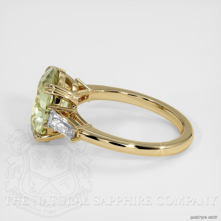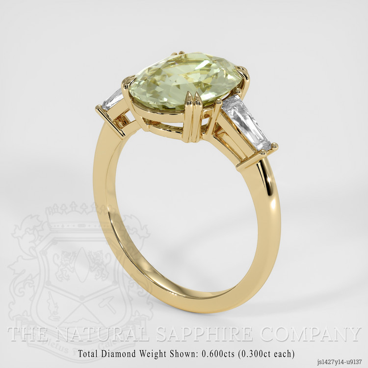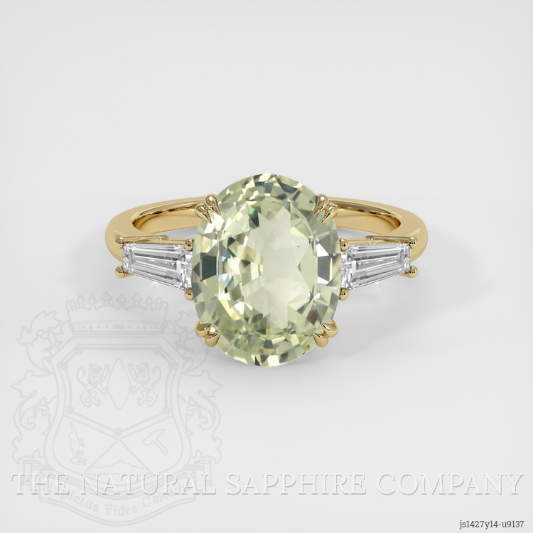 Introducing an exquisite masterpiece from The Natural Sapphire Company, where gemstones meet artistry in their most luxurious form. This ring embodies elegance with a rare 4.74 carat oval-shaped sapphire, distinguished by its unique greenish-yellow hue. The sapphire, measuring 11.87 x 9.31 x 5.26 mm, reflects light in the most mesmerizing manner, thanks to its mixed brilliant cut. This precision of faceting allows each ray of light to dance across its surface, captivating the eye with a vivid display of brilliance.