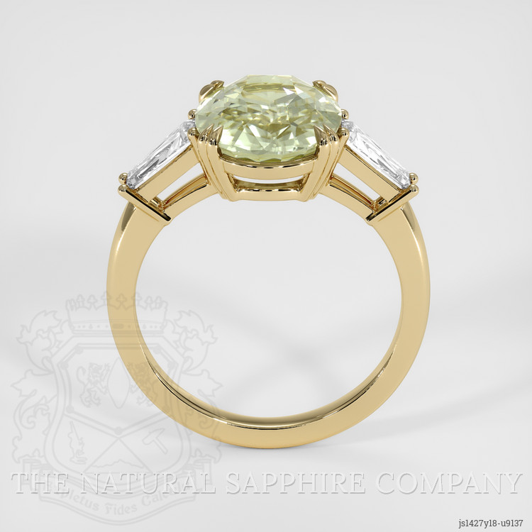 Introducing an exquisite masterpiece from The Natural Sapphire Company, where gemstones meet artistry in their most luxurious form. This ring embodies elegance with a rare 4.74 carat oval-shaped sapphire, distinguished by its unique greenish-yellow hue. The sapphire, measuring 11.87 x 9.31 x 5.26 mm, reflects light in the most mesmerizing manner, thanks to its mixed brilliant cut. This precision of faceting allows each ray of light to dance across its surface, captivating the eye with a vivid display of brilliance.