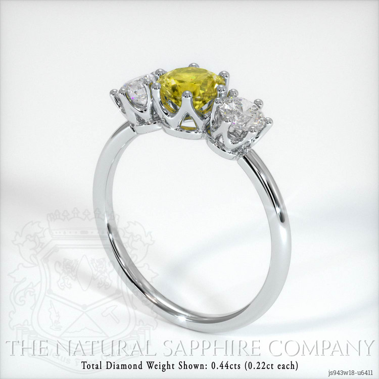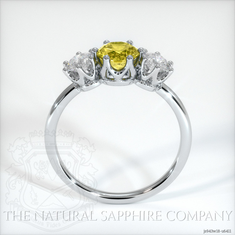 The ring features a beautiful, transparent 0.80 carat round shape greenish yellow sapphire with the dimensions of 5.61 x 5.50 x 3.68 mm and a brilliant cut. It has a clarity grade of very slightly included (evaluated at eye level), medium intense color saturation, and an excellent polish. The origin of this sapphire is Ceylon (Sri Lanka).