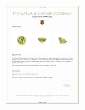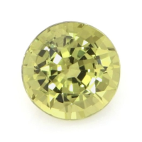 The ring features a beautiful, transparent 1.17 carat round shape greenish yellow sapphire with the dimensions of 6.08 x 6.02 x 4.18 mm and a mixed brilliant cut. It has a clarity grade of eye clean (evaluated at eye level), medium intense color saturation, and an excellent polish. The origin of this sapphire is Ceylon (Sri Lanka).