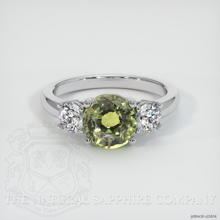 The ring features a beautiful, transparent GIA certified Greenish Yellow 2.58 carat round shape greenish yellow sapphire with the dimensions of 7.76 x 7.66 x 5.20 mm and a modified brilliant cut. It has a clarity grade of very slightly included (evaluated at eye level), intense color saturation, and an excellent polish. The origin of this sapphire is Montana.