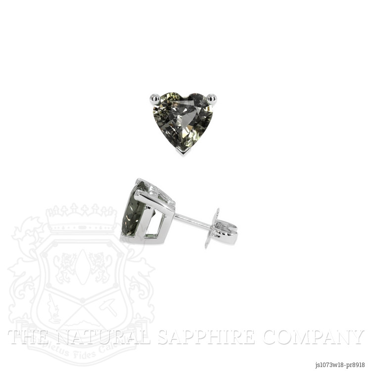 This pair of heart shaped grey sapphires, offered by The Natural Sapphire Company, presents a refined balance of gemological quality and wearable elegance. The combined weight is 0.88 carats, approximately 0.44 carat per stone, with individual dimensions of 5.02 by 4.98 by 2.58 millimeters, and a mixed brilliant cut that maximizes return of light while preserving the heart silhouette. These sapphires display intense color saturation within the grey family, a tone prized for its versatility and subtlety, and they exhibit an excellent polish that enhances sparkle and surface luster. Clarity is graded as very slightly included when evaluated at eye level, indicating only minor internal features that do not detract from overall brilliance or beauty. The stones are heat treated, a stable and widely accepted enhancement that improves color and clarity without compromising structural integrity. Origin is Ceylon Sri Lanka, a provenance with a long history of producing high quality sapphires, and the stones are securely set in platinum 950, a dense, durable metal that provides long term stability and a neutral tone which complements the grey sapphires.