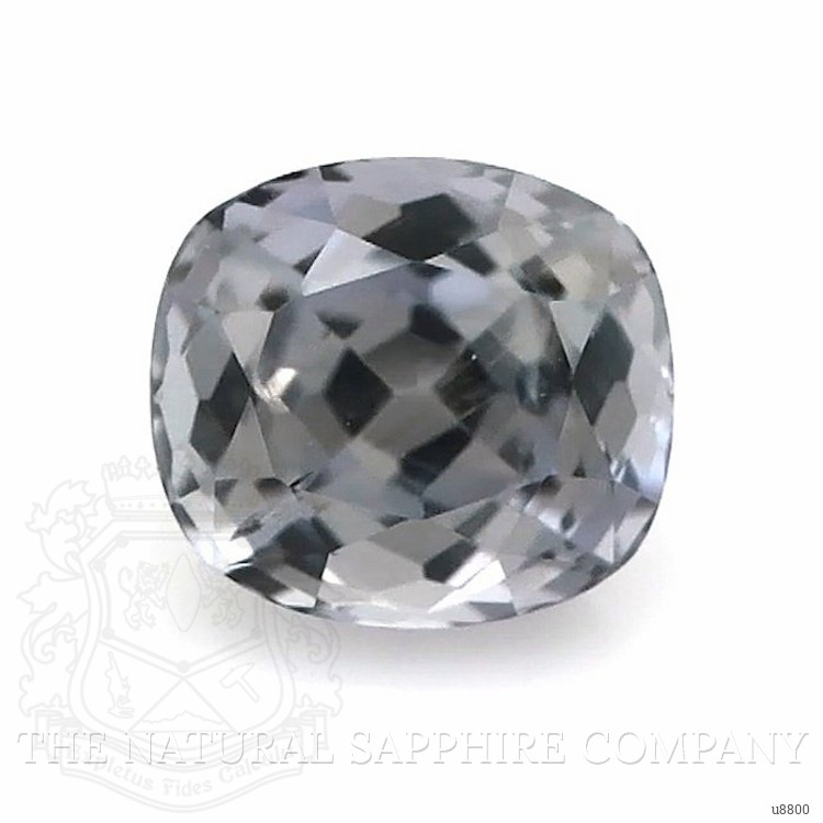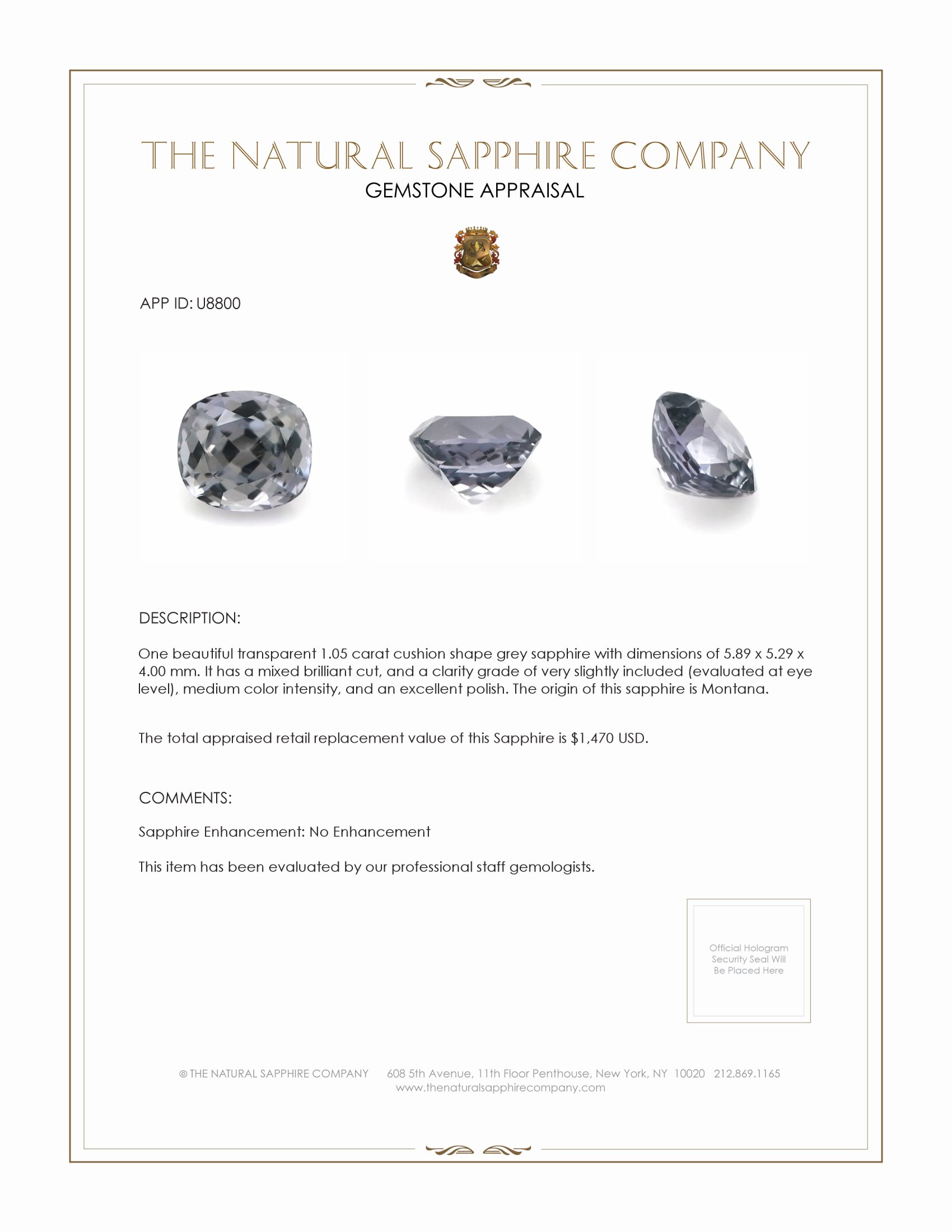 The ring features a beautiful, transparent 1.05 carat cushion shape grey sapphire with the dimensions of 5.89 x 5.29 x 4.00 mm and a mixed brilliant cut. It has a clarity grade of very slightly included (evaluated at eye level), medium color saturation, and an excellent polish. The origin of this sapphire is Montana.