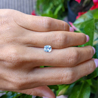 The ring features a beautiful, transparent 1.18 carat cushion shape grey sapphire with the dimensions of 6.46 x 5.67 x 3.66 mm and a mixed brilliant cut. It has a clarity grade of very slightly included (evaluated at eye level), very light color saturation, and an excellent polish. The origin of this sapphire is Montana.