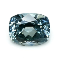 The ring features a beautiful, transparent 0.99 carat cushion shape greyish blue sapphire with the dimensions of 6.03 x 5.13 x 3.85 mm and a mixed brilliant cut. It has a clarity grade of very slightly included (evaluated at eye level), medium intense color saturation, and an excellent polish. The origin of this sapphire is Montana.