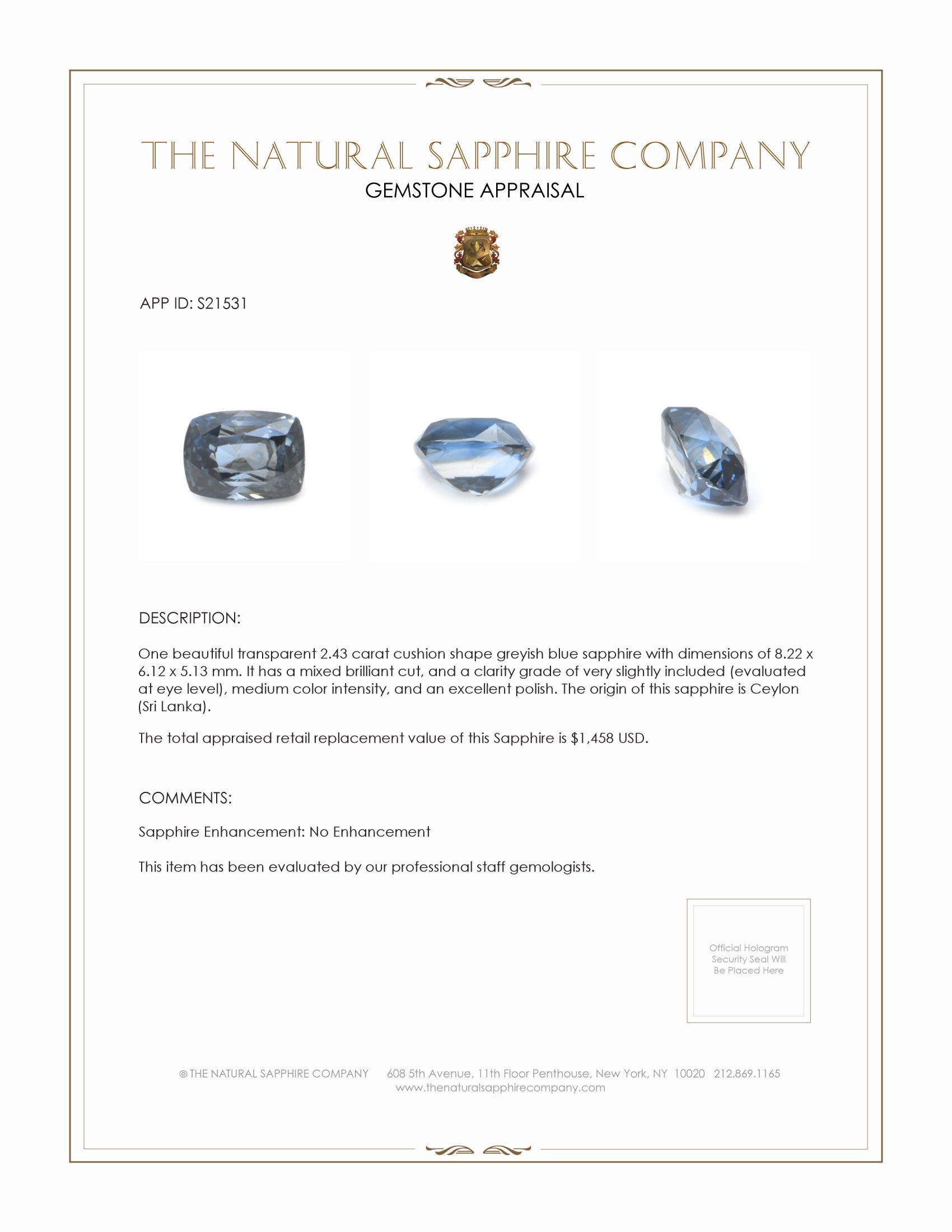 This sapphire began its story deep within the metamorphic rocks of Ceylon, a place where heat, pressure and time conspire to form gems that have been treasured for centuries. Mined with care by small teams in Sri Lanka, this stone emerged as a rough crystal that already hinted at its gentle greyish blue hue. At The Natural Sapphire Company we follow that journey from mine to master cutter, because we believe the life of a gemstone matters as much as its beauty. The 2.43 carat cushion shape sapphire was selected for its transparency and inherent balance of tone, and its dimensions of 8.22 x 6.12 x 5.13 mm reveal a substantial presence that reads as both masculine and refined. The mixed brilliant cut was chosen to enhance the stone s internal life, to open up flashes from within and to give the gem a liveliness that flatters a confident, everyday piece of jewelry.