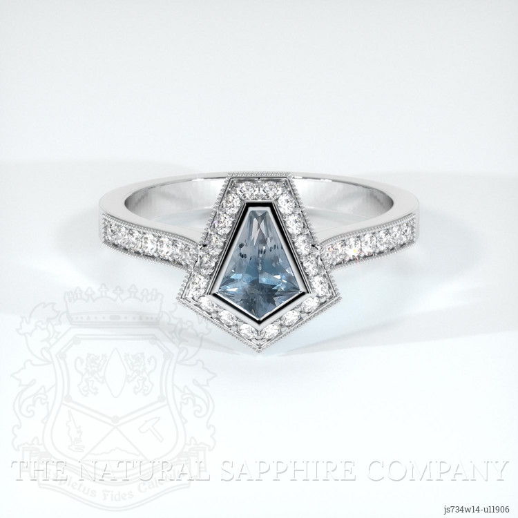 The ring features a beautiful, transparent 0.71 carat fancy shape greyish blue sapphire with the dimensions of 7.09 x 5.48 x 3.42 mm and a fancy brilliant cut. It has a clarity grade of very slightly included (evaluated at eye level), medium color saturation, and an excellent polish. The origin of this sapphire is Montana.